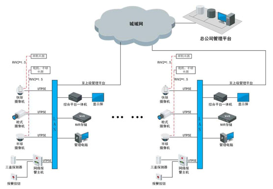前端摄像机就近通过超五类网线进入接入层交换机,快球摄像机、枪式摄像机、半球摄像机的视频信号均通过网线传输;快球摄像机的控制信号同样通过网络传输到前端摄像机,实现管理控制。