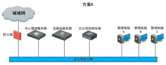 方案A,可以通过对访问人员的授权,实现对分布在全国各地营业店的不同访问权限。系统架构图如下:
