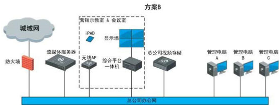 方案B,可通过对访问人员的授权,实现对分布在全国各地营业店的不同访问权限;同时可在总部内部搭建一套营销示教系统,总部销售总监、销售培训主管可以利用该平台,对各区域督导进行实战培训,系统可通过iPAD直接控制显示墙,方便授课人员灵活操控。系统架构图如下: