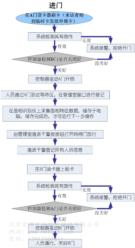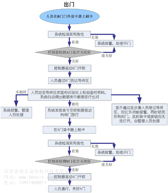 2、通道的中间设立宽1.5米左右高2.米左右的转闸门,进监狱刷卡通过A门,进入通道再由值班干警确认,按钮放行通过转闸门,最后刷卡通过B门。出监狱通过B门,进入通道再由人脸识别比对成功后,自动放行通过转闸门,最后通过A门,比对不成功报警。出只能人脸比对成功后才能通过转闸门其他任何方式都不能打开转闸门。