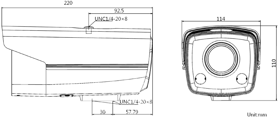 | 其他 | 防护等级IP67电源供应DC12 V ± 25% / PoE(802.3af)工作温度和湿度-30℃ ~ 60℃,湿度小于95%(无凝结)功耗非PoE: 7.5 W MaxPoE: 9.5 W Max重量裸机重量:920 g带包装重量:1170 g尺寸220 × 114 × 110 mm最远补光距离30 m |